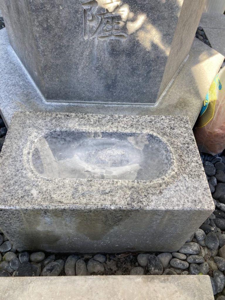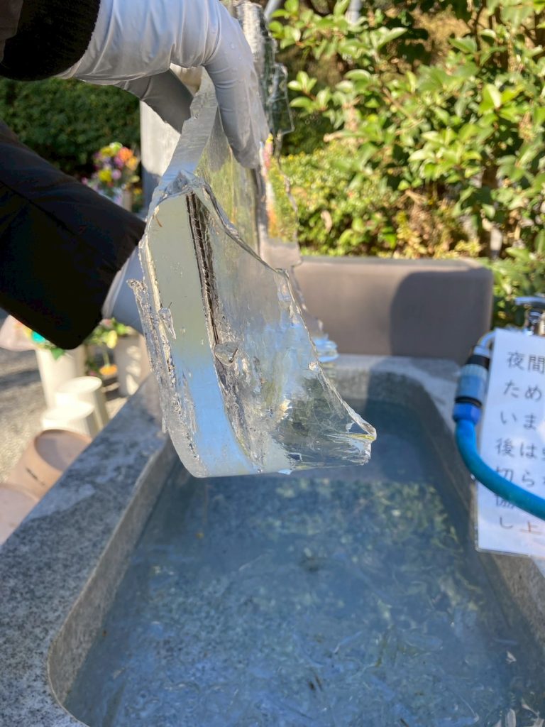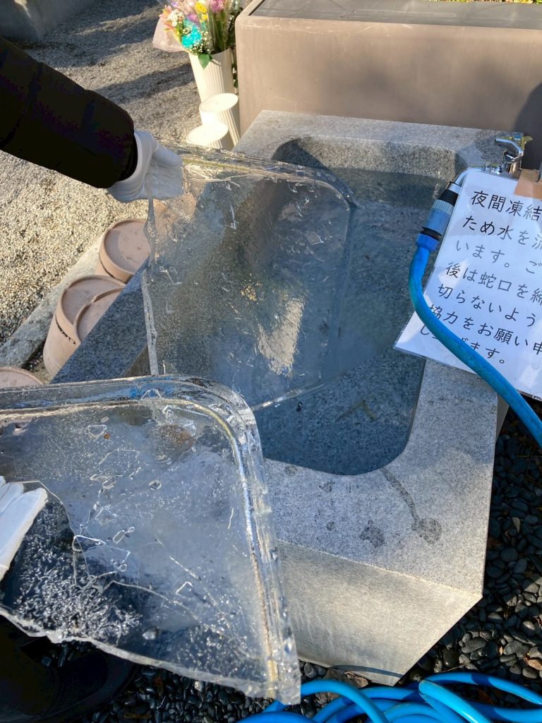 共同墓地や屋外の観音様前の水受けも凍ってしまい、